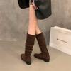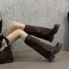 Autumn and winter leather fashion boots solid color versatile square head medium heel large size women's boots new cow fleece slope heel high boots