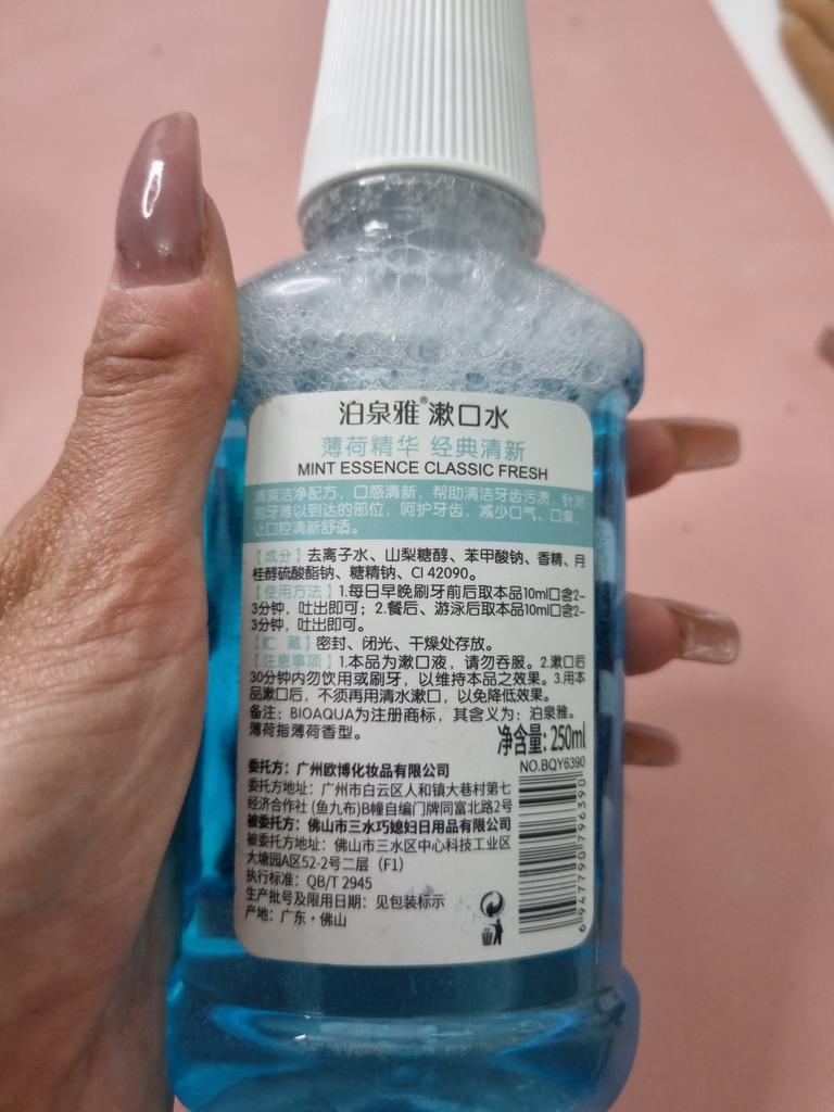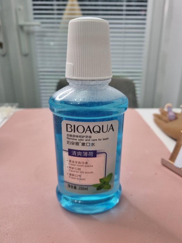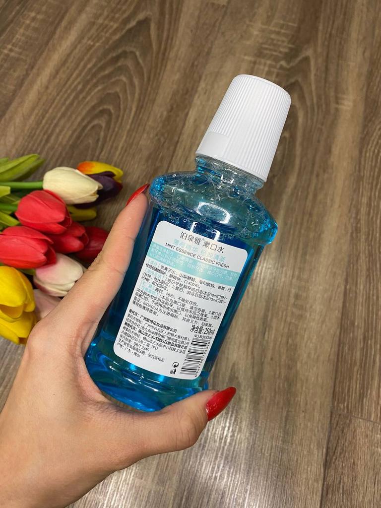Mouth wash 😋 Mint-flavoured mouthwash. Gets rid of bad breath, helps fight plaque and gum disease Do not swallow. Swill around the mouth and through teeth them spit out Use after teeth brushing or between brushing your teeth 2-year shelf life The text is in Chinese so can't understand the packaging