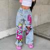 שרשרת מקדחה ארוכה ספייס בנות ג'ינס דק נשים קיץ עיצוב צד מפוצל מקרית מכנסיים רפויים ישרים