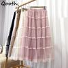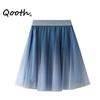 Qooth Women A-line Tulle Gradient Ruffle Skirt Wide Hem Mid Length Elastic Waist Casual Skirt QT2636