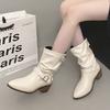 Metal Belt Buckle Riding Boots Women 2025 Autumn Sexy Pointed Toe Medium Heel Western Ankle Boots Casual White Pu Slip On Shoes