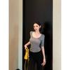 Discoglam High Sense Versitile Fashion Slim fit Slimming Short Breasted U Collar Gray Short sleeve T-shirt Women Summer