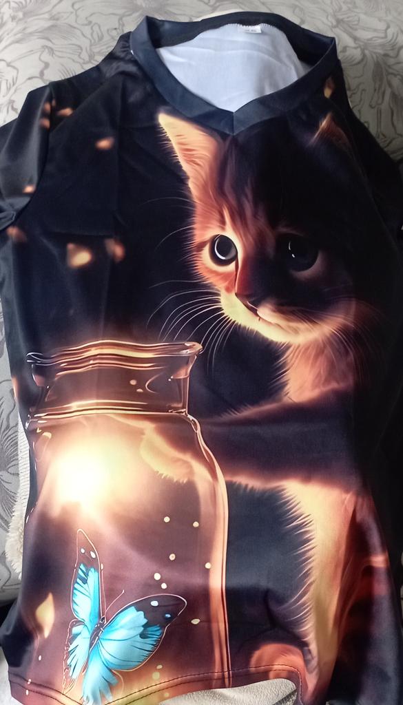 Trykket er sterkt, tydelig. Ikke bomull. Stretch. Sammensetning: bambus. I varmt vær vil du ikke bruke den, men den ser veldig vakker ut, som fra et bilde🤗. Etter vask har den ikke mistet utseendet💪Anbefaler👍🏻
