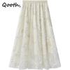 Qooth Women A Line Bead Chiffon Skirt Wide Hem Mid Length Elastic Waist Slim Casual Skirt QT2650